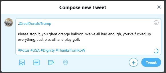 President Trump issued a statement explaining the reason for this sudden decision, “I’d just finished my McDonald’s and was having a quiet ten on the toilet, reading my twitter feed, when I saw a tweet, sent by Gav from Eastbourne. It called me a giant orange balloon and said I was doing a crap job. It then suggested I leave quickly and go and play golf.”