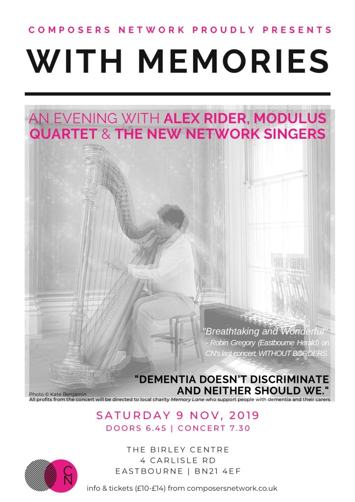 Eastbourne’s new and exciting Composers Network are following up their acclaimed and sell-out “Without Borders” concert with a second concept performance “With Memories”. The concert brings acclaimed young Harpist Alex Rider, London’s Modulus String Quartet and The New Network Singers to The Birley Centre in Eastbourne on Saturday 9 November.